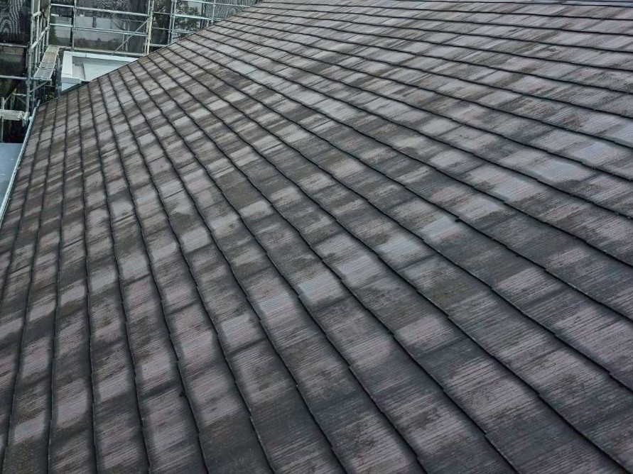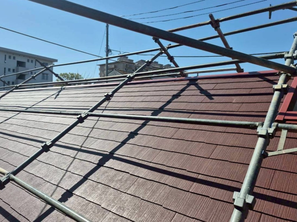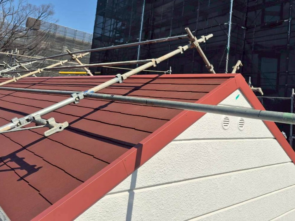 屋根葺き替え工事を行わせて頂きました!葺き替え(ふきかえ)とは、古い屋根材を剥がしてから、新しい屋根材を施工する工事です。今回は、屋根材の王道、スレート屋根、カラーベストなどと呼ばれる商品「コロニアルグラッサ」を使用しました。金属屋根には中々無い豊富な色のバリエーションがあります✨今回は、ボルドーレッドを使用しました。
