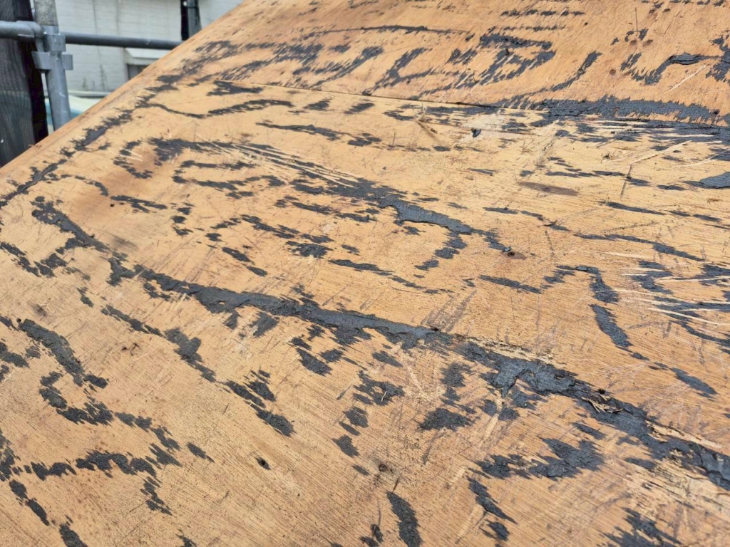 屋根材を剥がすと、古いルーフィングが出てきます。